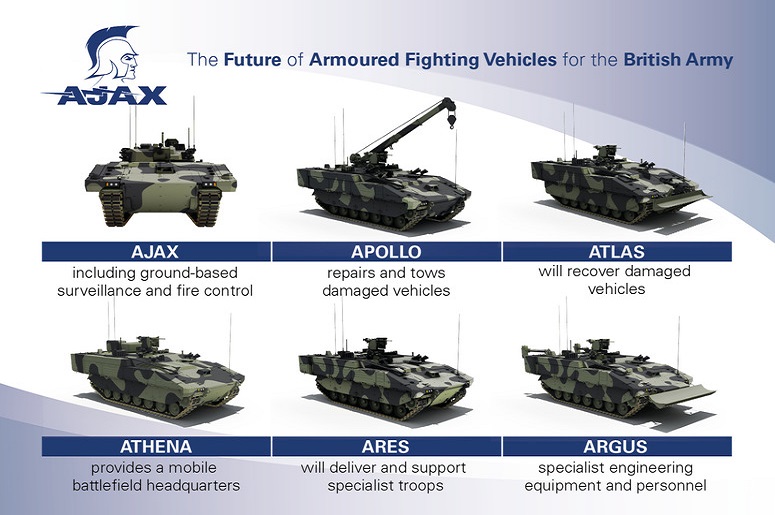 به طور کلی، ارتش انگلیس خرید 589 خودرو زرهی مبتنی بر پلتفرم آژاکس را برنامه ریزی کرده است که دست کم هفت نوع مختلف را شامل می شوند. متاسفانه، نقایص طراحی موجود در نخستین خودروهای آژاکس تولیدی به اندازه ای بد هستند که ارتش انگلیس به واسطه نگرانی های ایجاد شده درباره سلامت سربازانی که از این خودرو استفاده می کنند، انجام آزمایشات آن را به حالت تعلیق درآورده است.