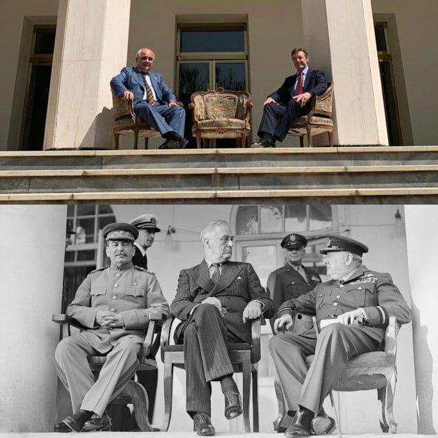 به گزارش عصرایران، این دیدار در محل سفارت روسیه در تهران برگزار شده. در عکس منتشر شده، صندلی خالی هم قرار دارد. این عکس بسیار به شبیه سازی عکس معروف دیدار سران بریتانیا، امریکا و روسیه در محل سفارت روسیه در تهران و در اوج جنگ جهانی دوم شبیه است.