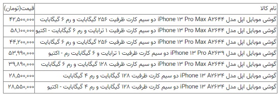 باشگاه خبرنگاران جوان: قیمت انواع گوشی آیفون در بازار منتشر شد. قیمت انواع گوشی آیفون ۱۳ در بازار به شرح زیر است: