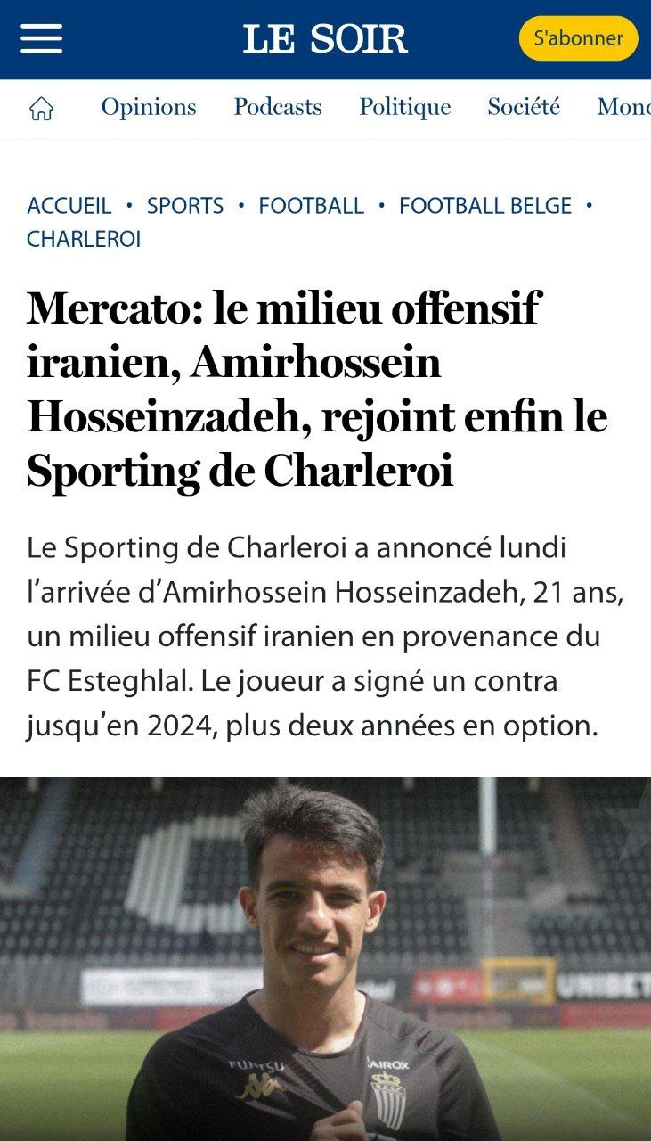 وب سایت lesoir بلژیک نیز این خبر را پوشش داد و نوشت: «اسپورتینگ شارلوا روز دوشنبه از ورود امیرحسین حسین‌زاده، هافبک تهاجمی 21 ساله ایرانی و سابق تیم استقلال خبر داد. این بازیکن قراردادی تا سال 2024 با قابلیت تمدید تا 2 سال دیگر را امضا کرده است.