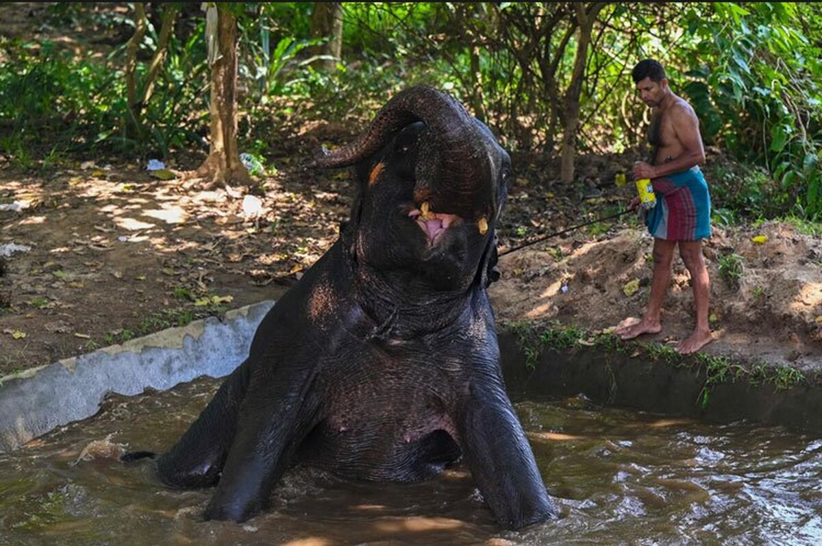 حمام کردن یک فیل درون گودال آب در سریلانکا/ خبرگزاری فرانسه