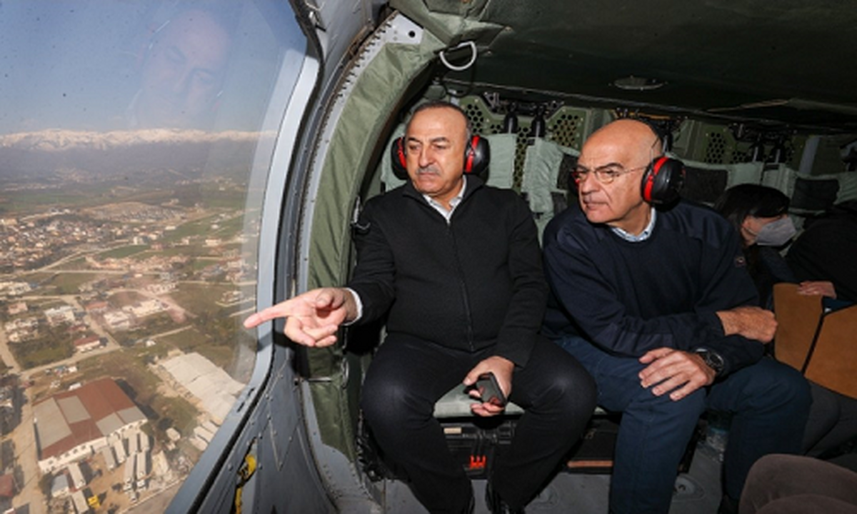 این عکس، وزیران خارجه یونان (راست) و ترکیه یعنی "نیکوس دیندیاس" و "مولود چاوش اوغلو" را نشان می دهد که به وسیله بالگرد در حال بازدید هوایی منطقه زلزله زده شهر انطاکیه ترکیه هستند. وزیر خارجه یونان دیروز یکشنبه به ترکیه سفر کرد.