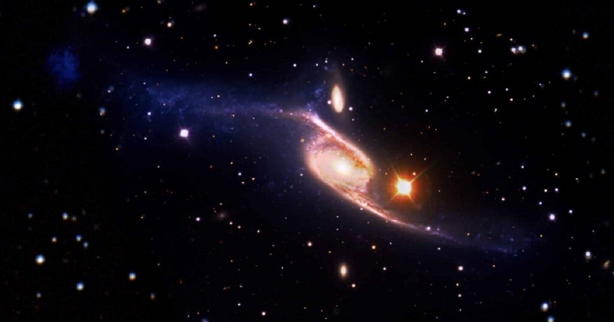 تصویری که بهتازگی با ترکیب دادههای چند تلسکوپ تهیه شده است، کهکشان مارپیچی NGC 6872 را بهنحوی خیرهکننده نشان میدهد. این کهکشان که بزرگترین کهکشان مارپیچی شناختهشده در جهان محسوب میشود، تقریباً پنج برابر کهکشان راه شیری است.