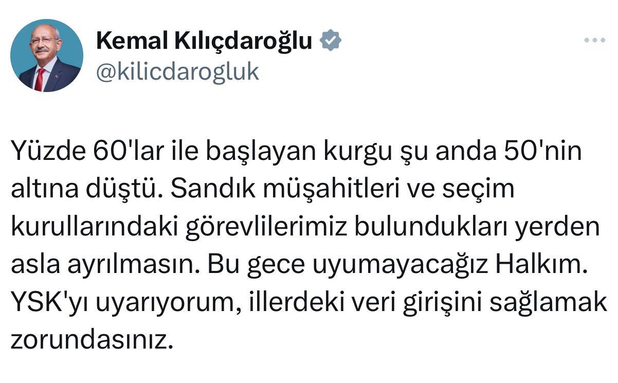 کمال قلیچدار اوغلو که تا قبل از اعلام نتایج انتخابات خود را برنده تصور می کرد، در توییتی با اشاره به این که خیال آرای 60 درصدی به زیر 50 درصد رسیده نوشت که امشب را نخواهیم خوابید./ عصر ترکیه